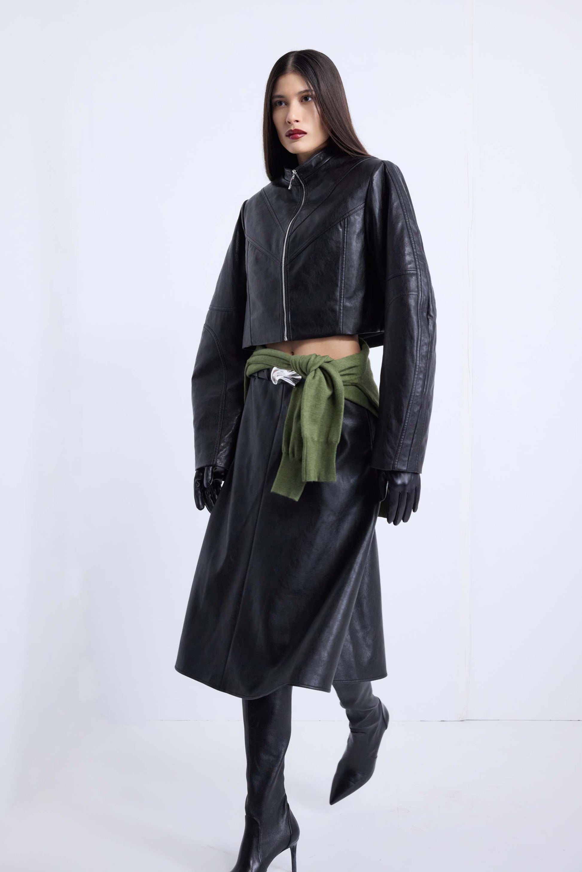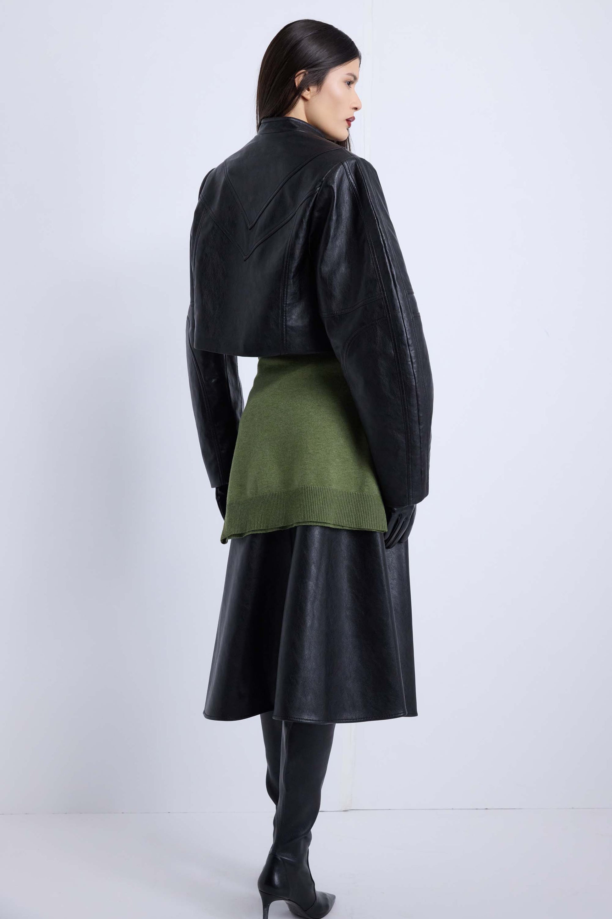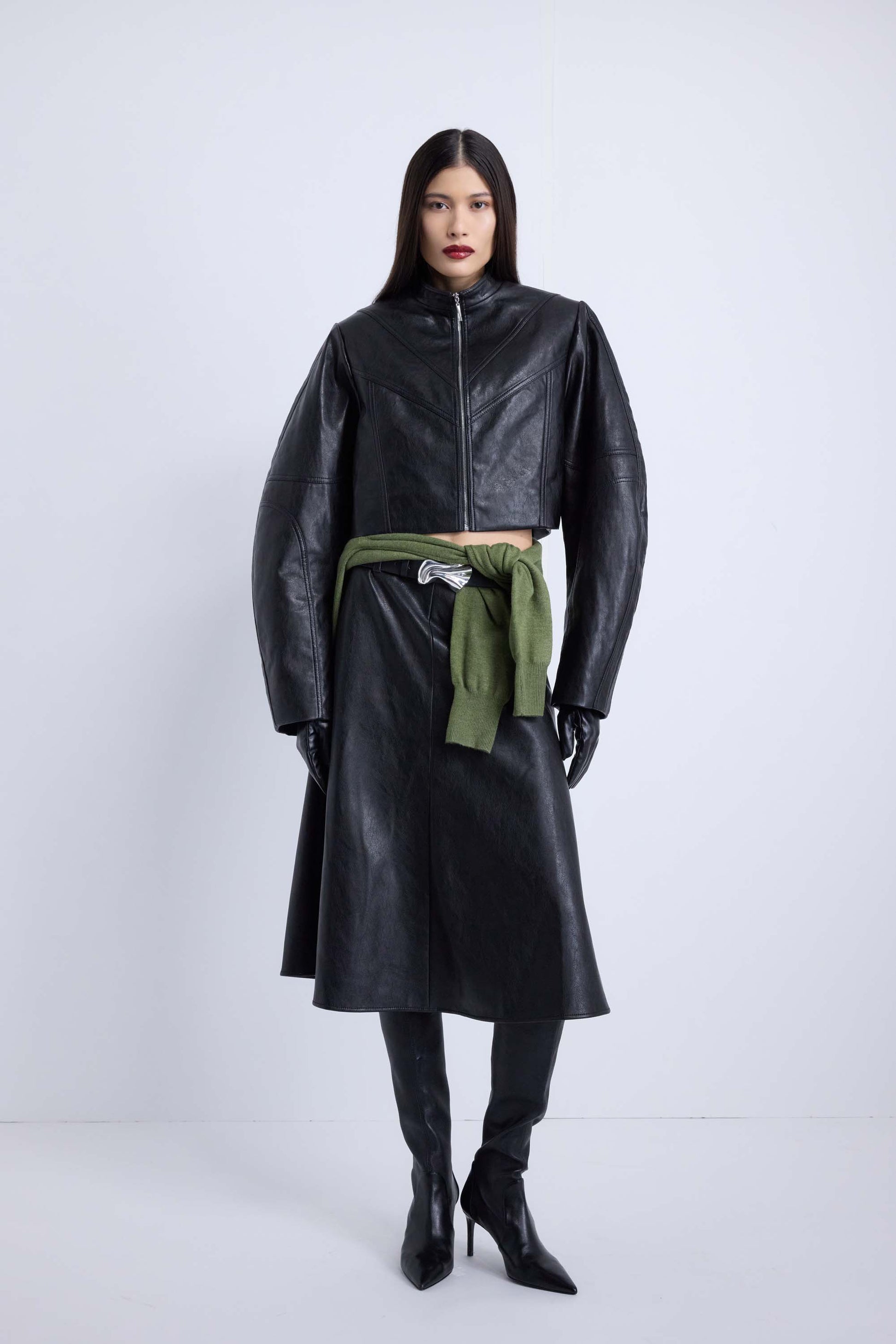 Leather A-line midi skirt.