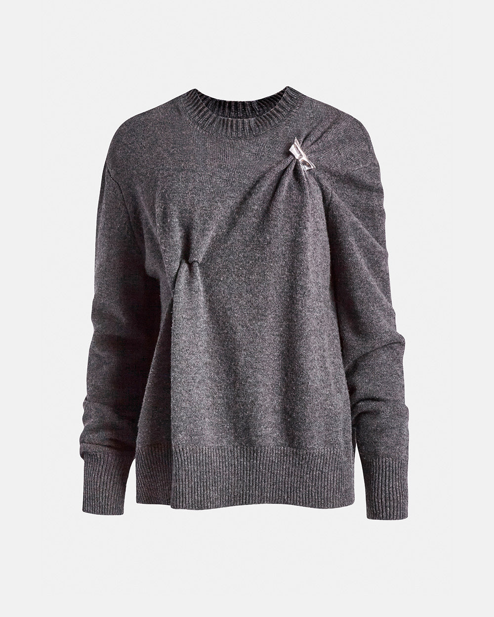 To maintain the luxurious feel of yourDraped Merino Cashmere Sweater, detach the brooch before washing. Hand wash with cold water and mild detergent or dry clean. Lay flat to dry and store folded to preserve the shape. Avoid wringing or twisting to protect the delicate merino wool and cashmere blend.