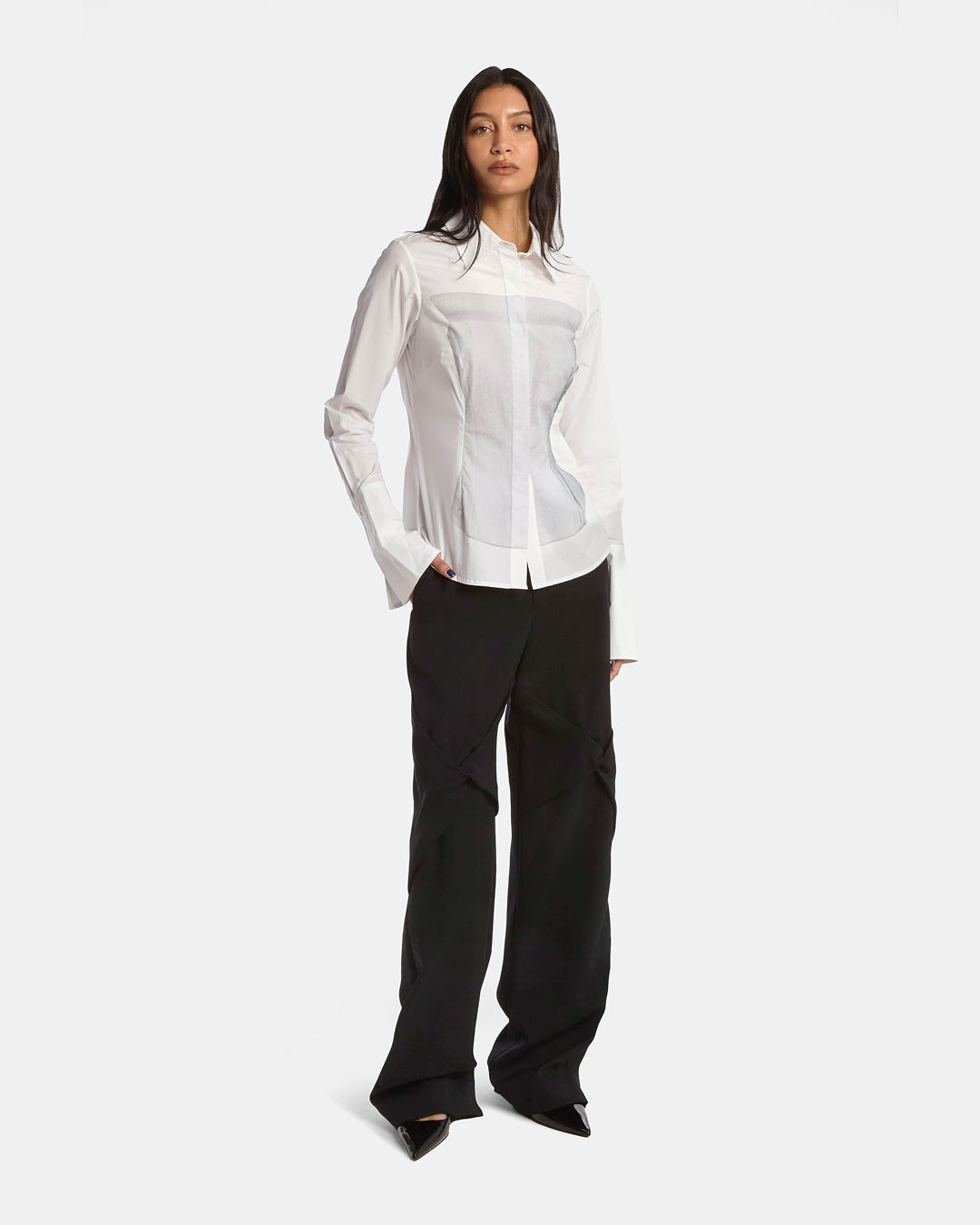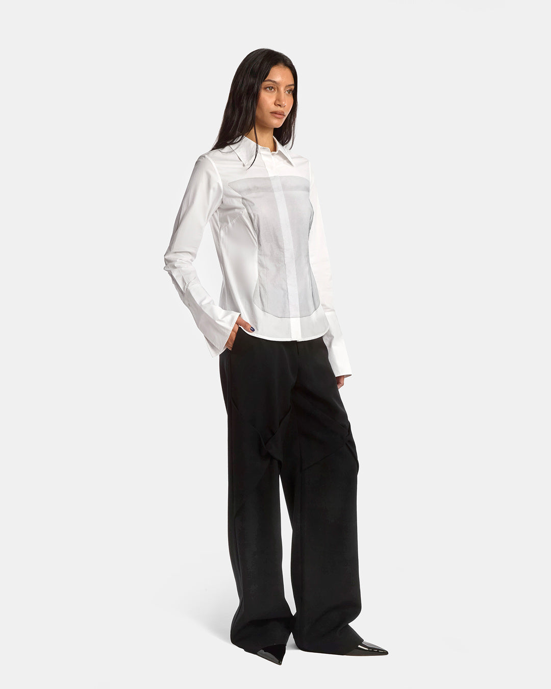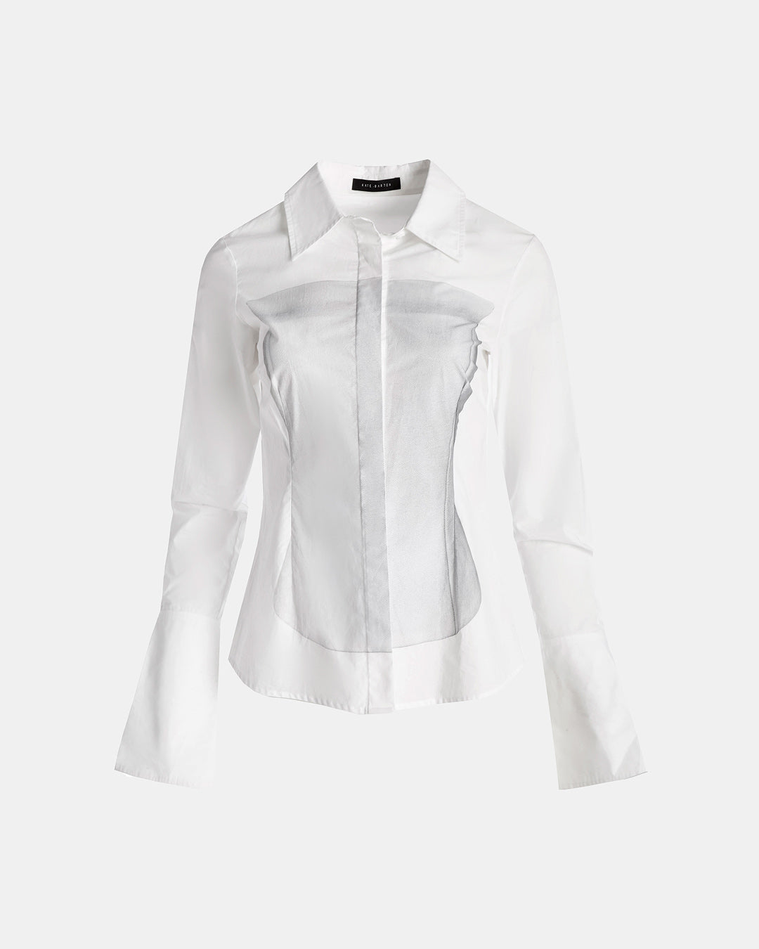 Long-sleeve button-down shirt crafted in lightweight cotton and finished with Kate’s signature illusion print. Designed with a hidden front placket, subtle waist shaping, and softly flared cuffs for a refined silhouette. Imported.