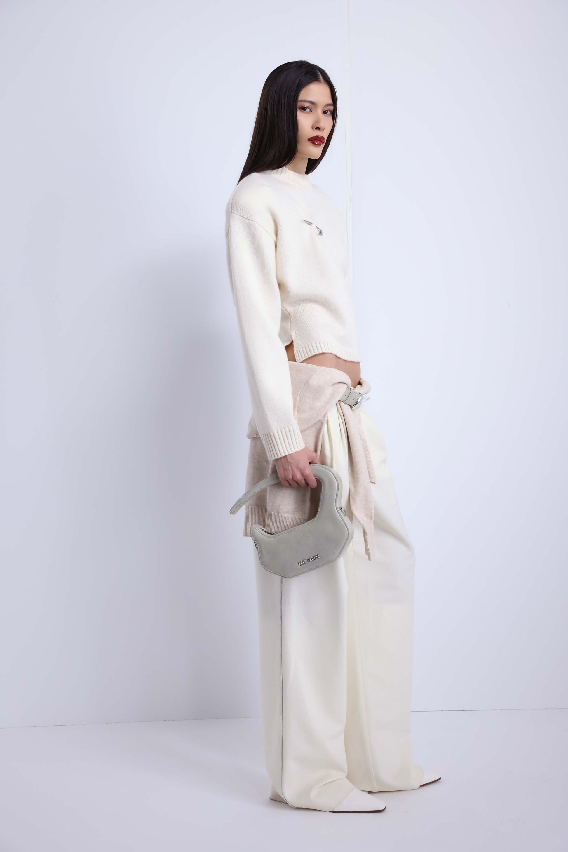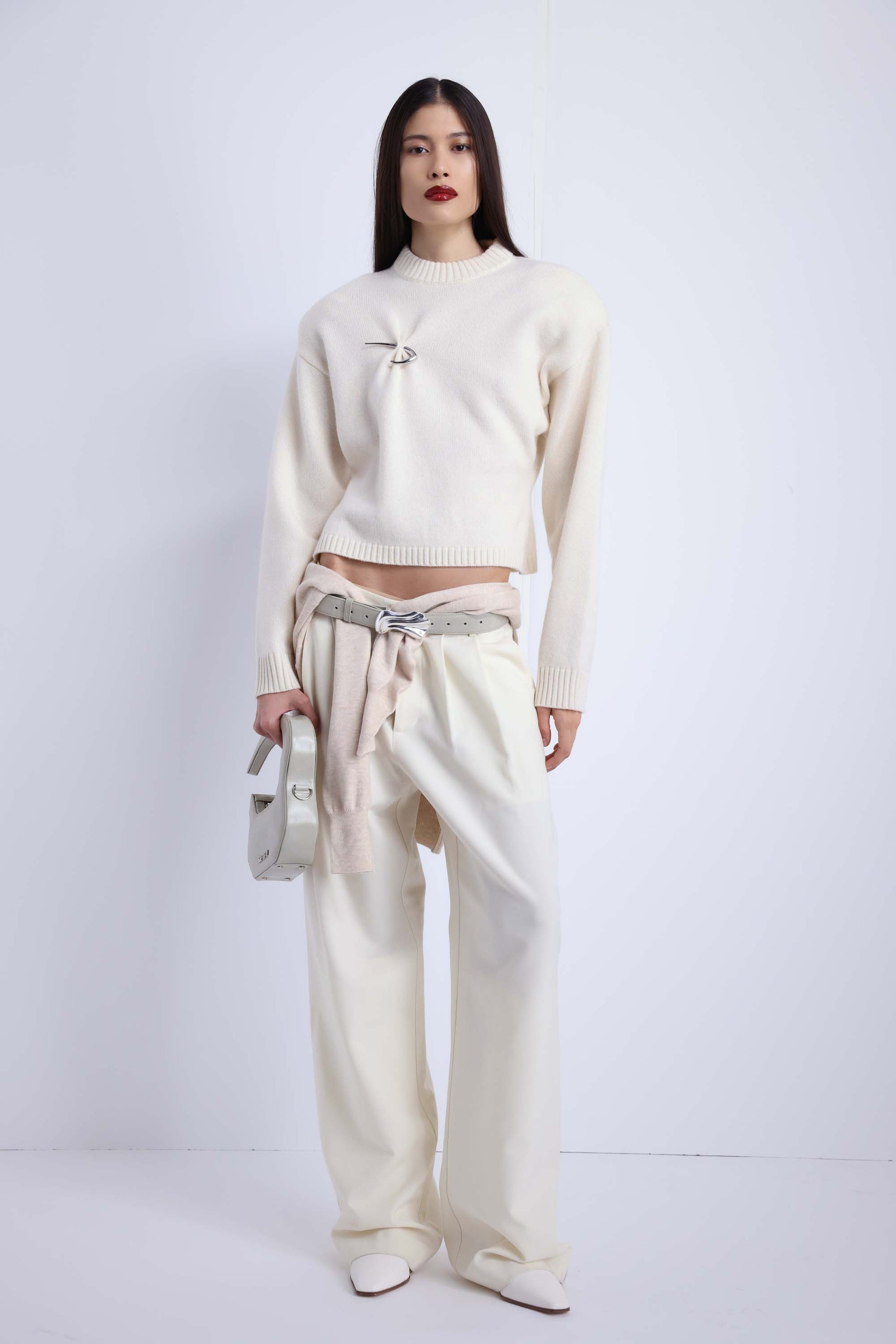 Lightly structured sweater with metal fish hook brooch detail.