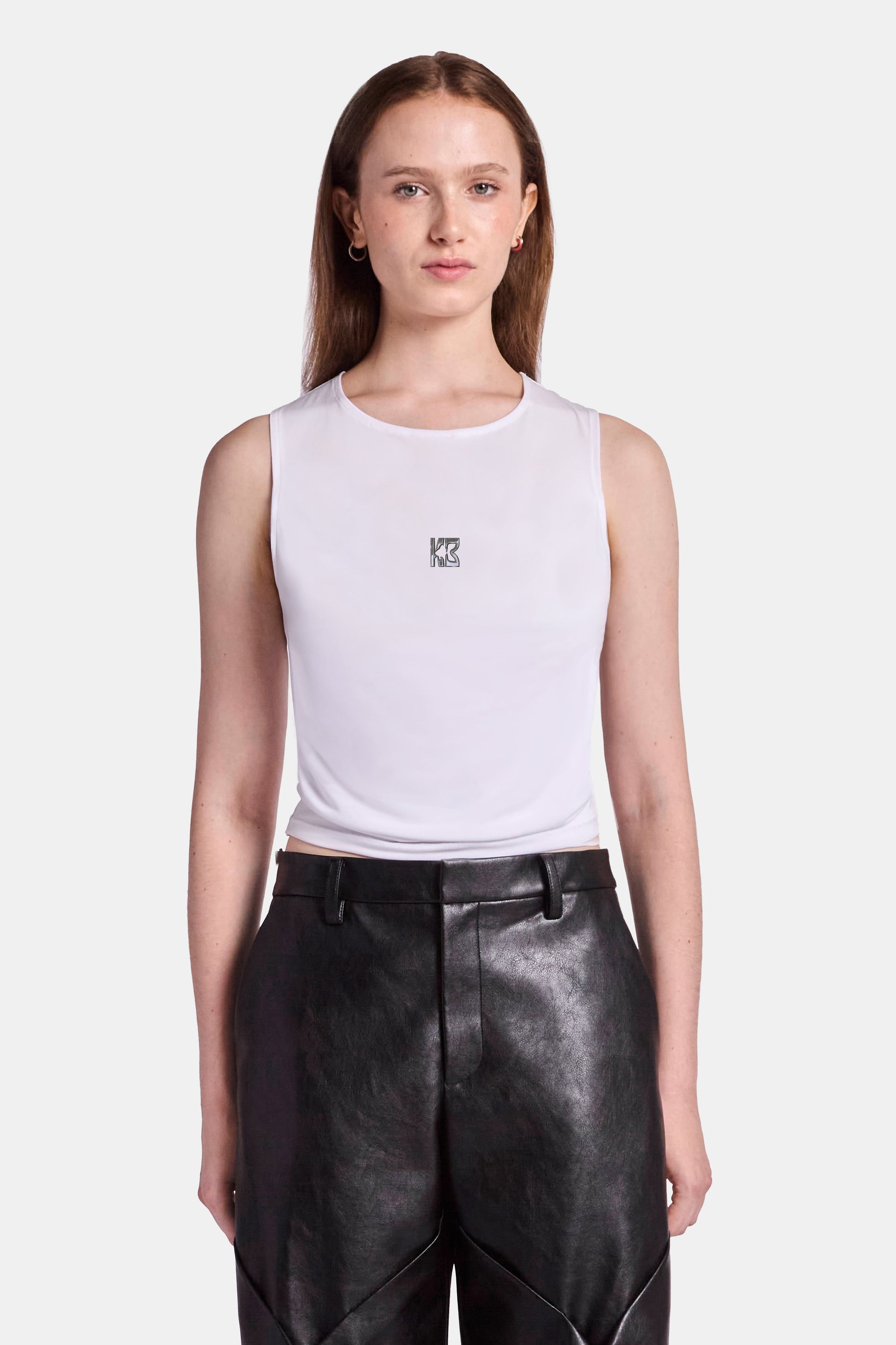White sleeveless fitted tank with round neck featuring a silver chrome KB emblem.
