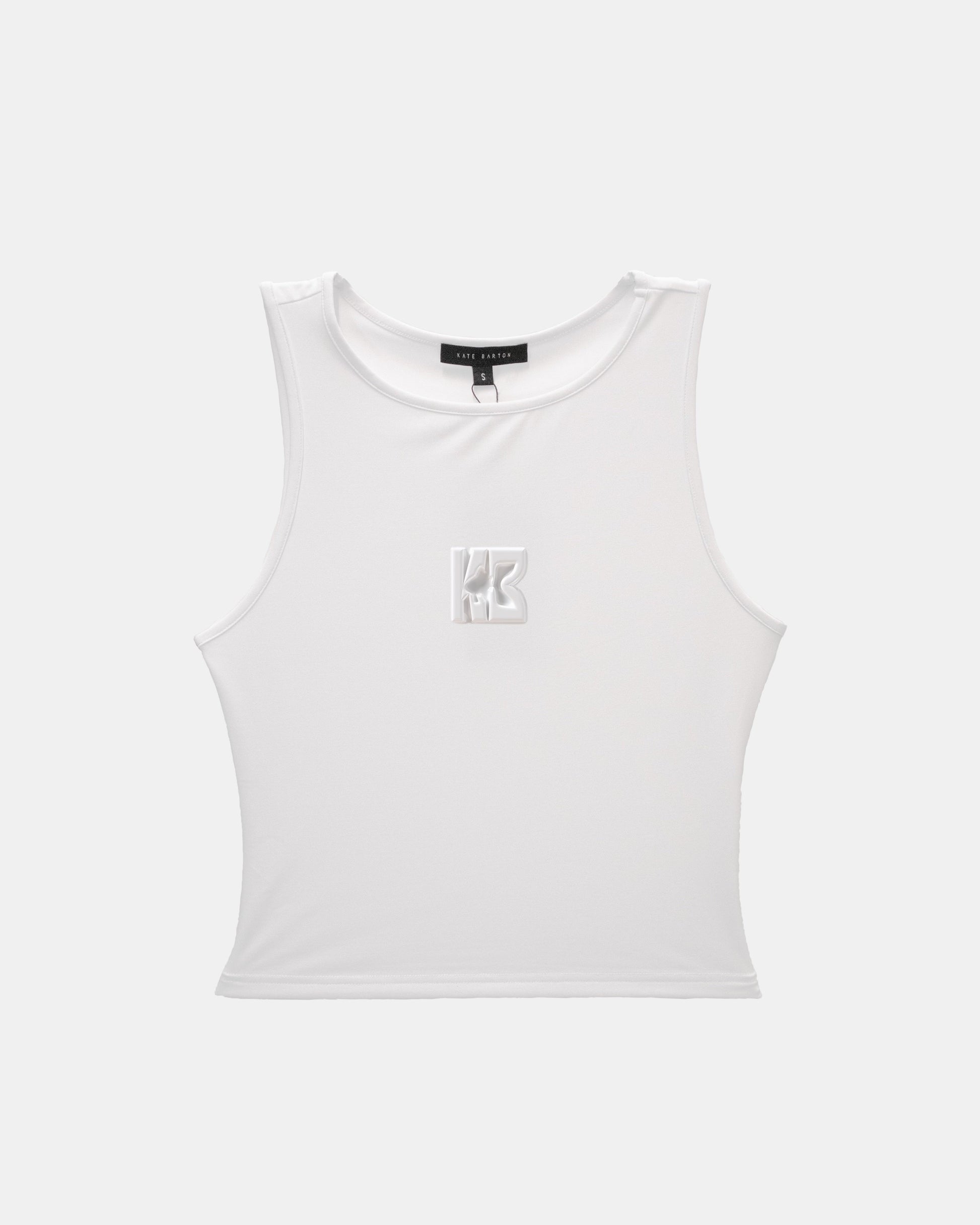 White sleeveless fitted tank with round neck featuring an ivory KB emblem.