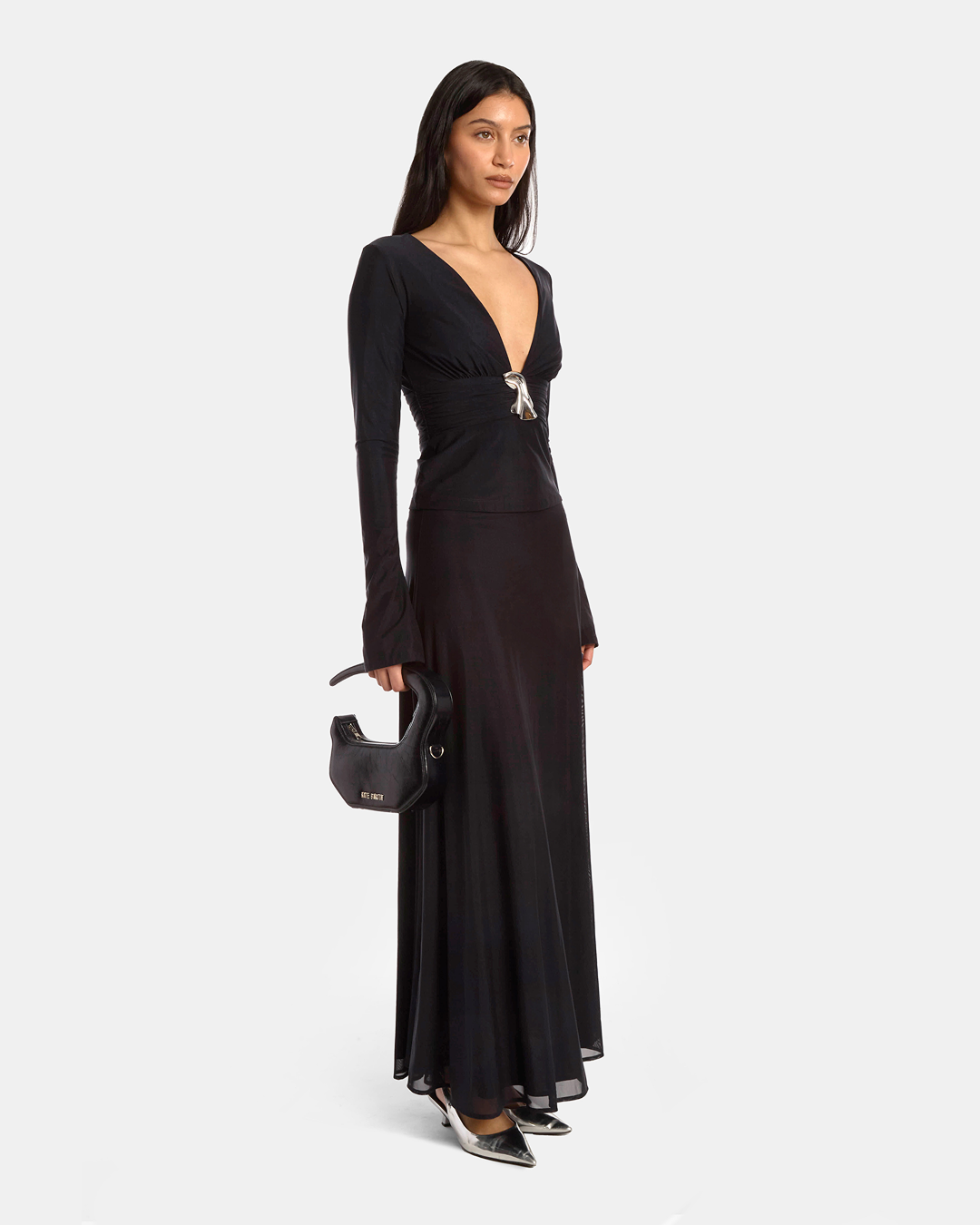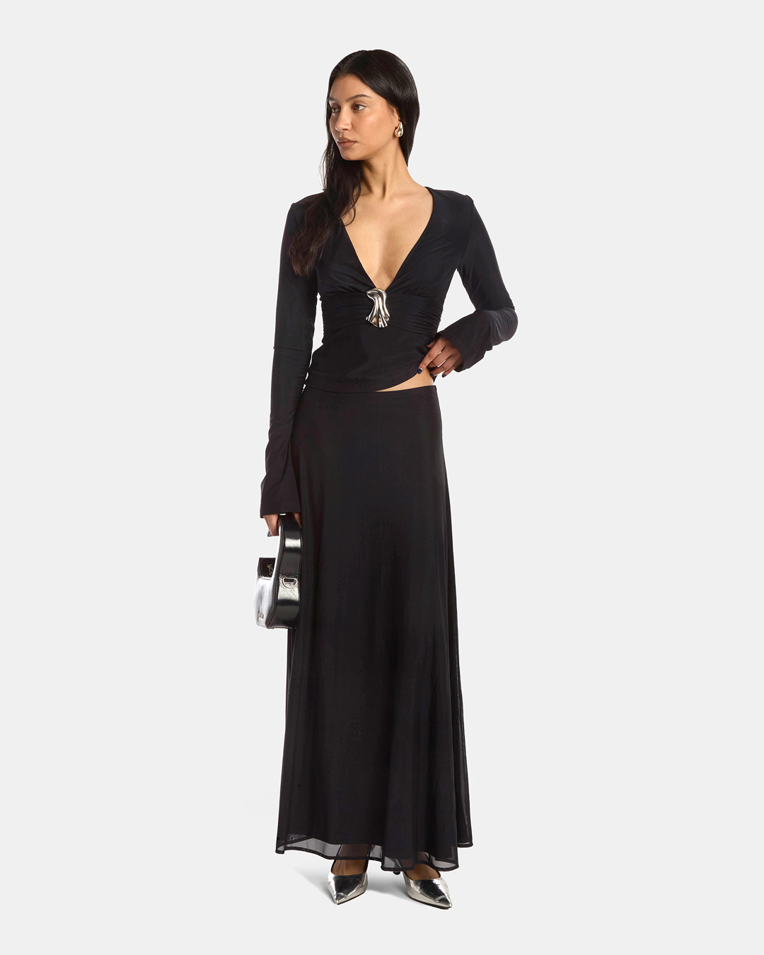 Plunge V-neck top featuring long mesh sleeves with flared wrists and a softly ruched bodice for a sculpted yet fluid fit. Finished with a silver sculptural detachable brooch for a bold accent. Fully lined through the bodice and completed with a discreet side seam invisible zipper. Imported.