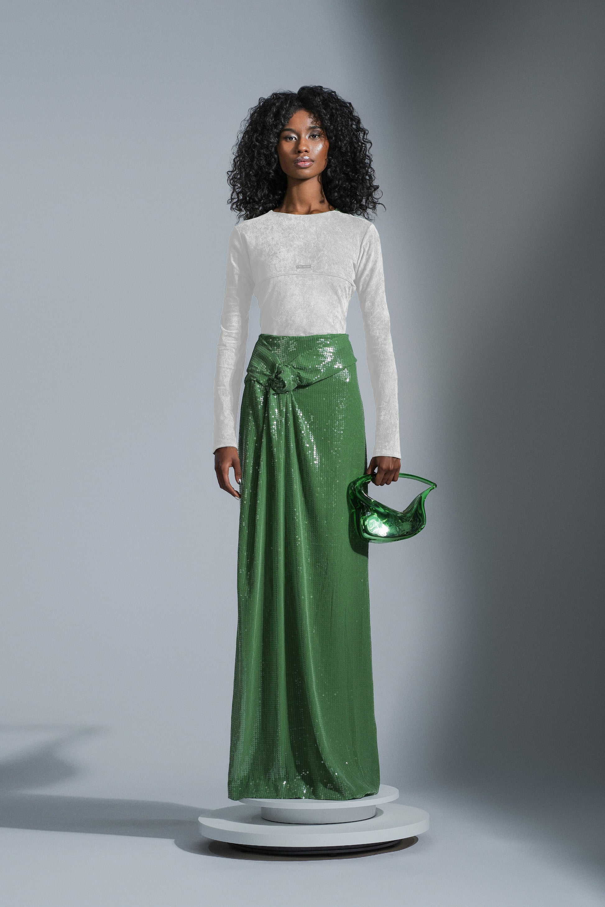 Long sleeve shirt made from ultra-smooth, snowy white microsuede with exceptional stretch for a clean, comfortable fit, featuring a piped bustline seam and a sleek and subtle KATE BARTON logo bar.