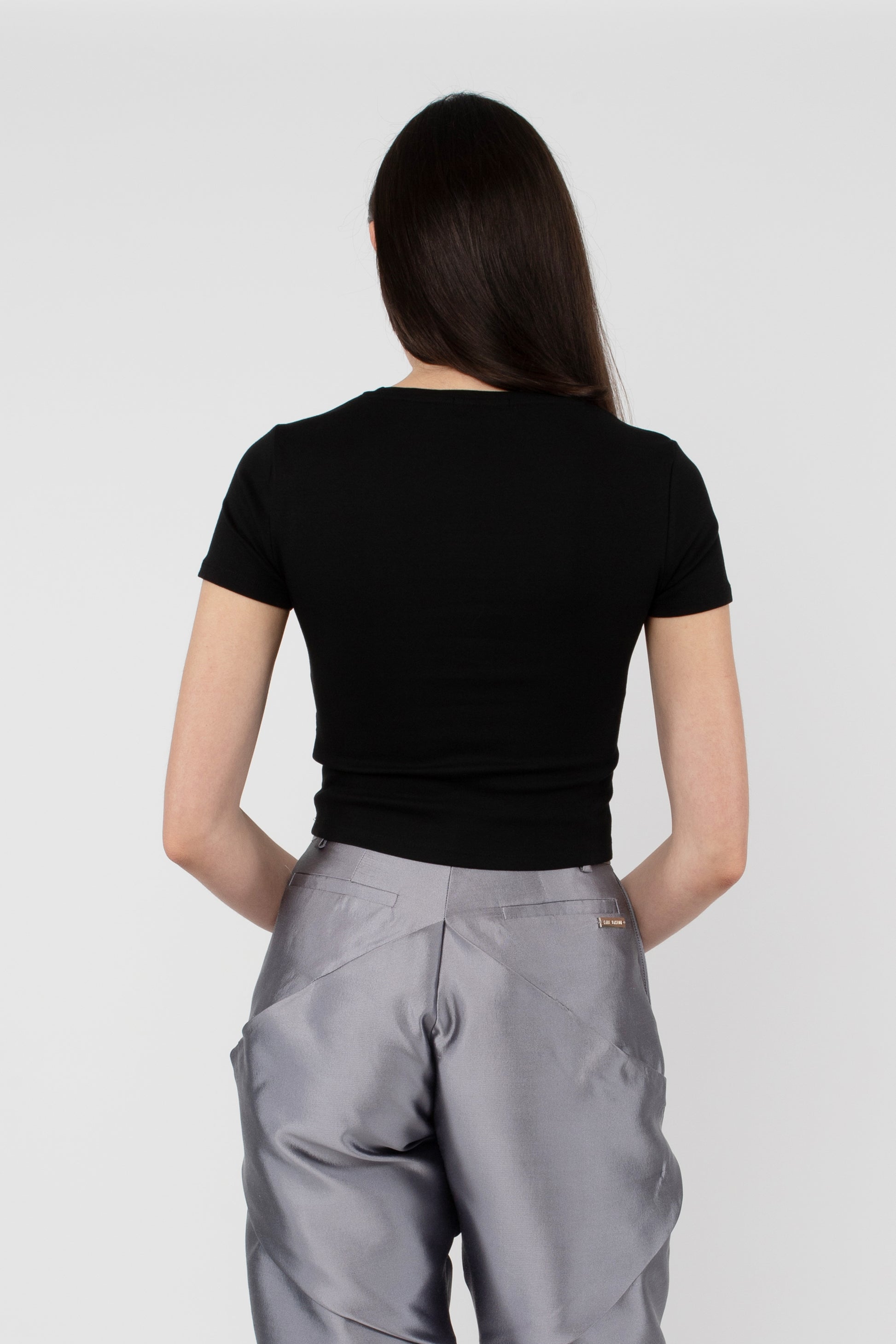 Black Cropped Short Sleeve T-shirt with round neck and our KB Chrome Molded Leather Corset print.